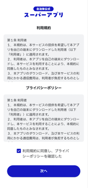 (3)アプリの利用規約・プライバシーポリシーをお読みの上チェックを入れ、「次へ」をタップします。